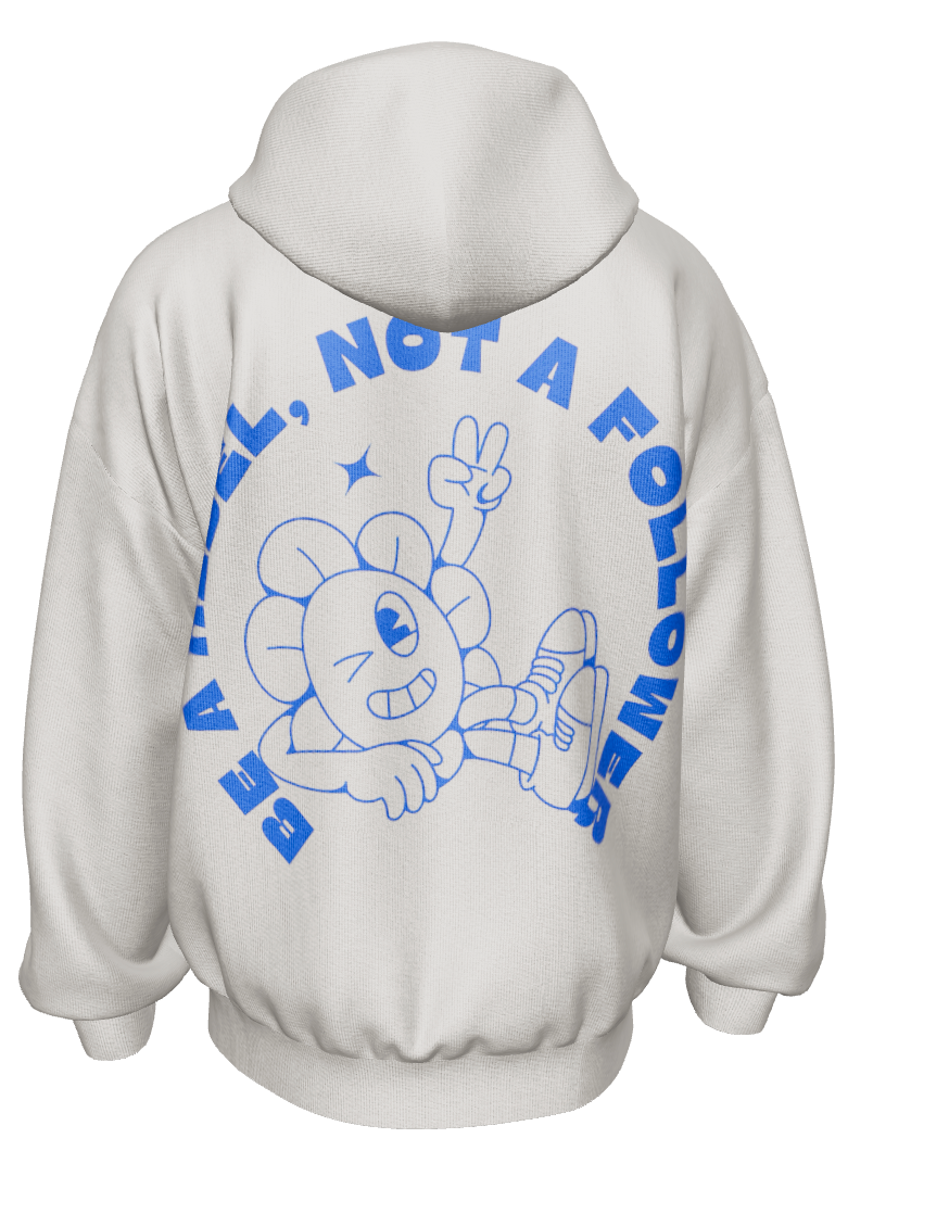 • Espalda: La frase “Be A Rebel Not A Follower” en azul, junto a la florecita rebelde guiñandote el ojo e invitandote a dejar fluir esa alma rebelde que tanto nos caracteriza.