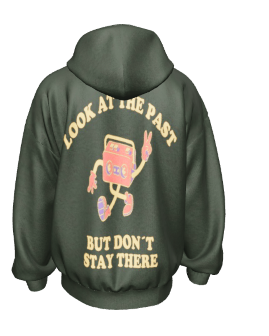 • Espalda: La frase “Look At The Past But Don´t Stay There” en amarillo, junto la pletina de casete caminando sin mirar hacia atrás, y enfocándose en lo importante del presente.