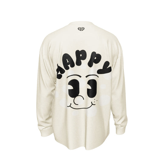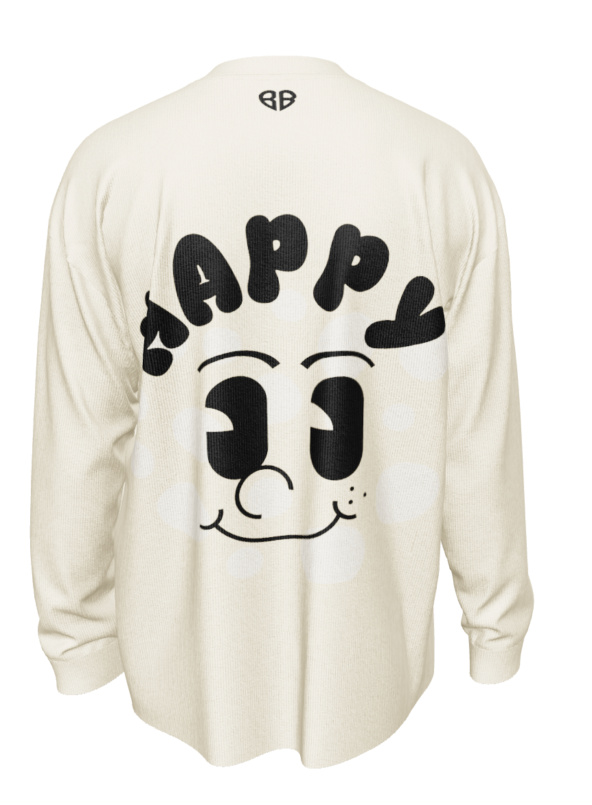 🎨 Diseño trasero: Gran gráfico con una carita feliz animada en negro rodeada por la palabra “Happy” en tipografía retro y curvada. El personaje se muestra bastante feliz, transmitiendo una vibración positiva, y sobre él, el icónico logo “BB” en negro.