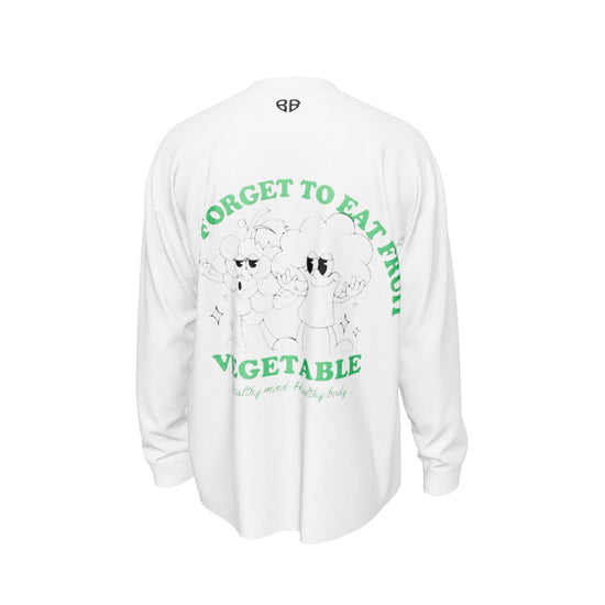 🎨 Diseño trasero: Gran gráfico con dos vegetales animados rodeados por la frase “Don´t Forget To Eat Vegetales” en tipografía retro y curvada, y sobre ello, el icónico logo “BB” en blanco.