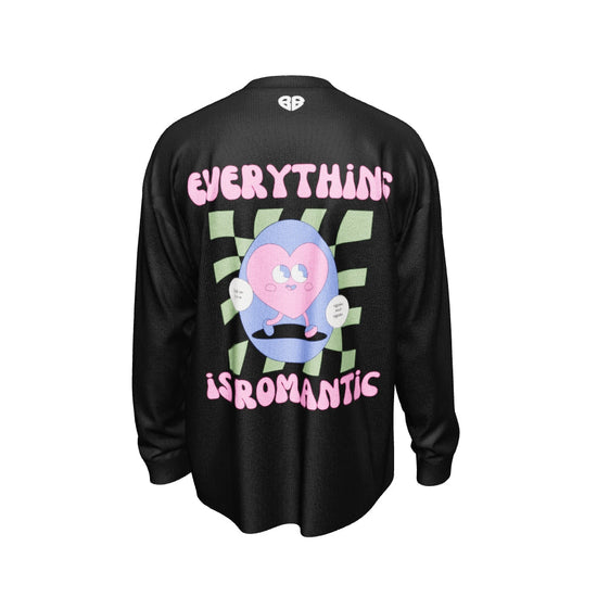 🎨 Diseño animado trasero: Gran gráfico con un corazón en rosa pastel rodeado por la frase “Everything Is Romantic” en tipografía curvada. El personaje es un tierno corazón, y encima el icónico logo “BB” en blanco.