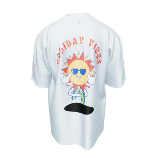 Estampado ruptura icónica de Broken Boy en rojo, posicionada en la parte superior de la espalda, reafirmando la identidad de la marca, mientras que en la parte inferior un sol con altas vibras vacacionales, reflejando el lado cool de la vida y de alguien que sabe disfrutar de ella con la frase "Holiday Vibes"