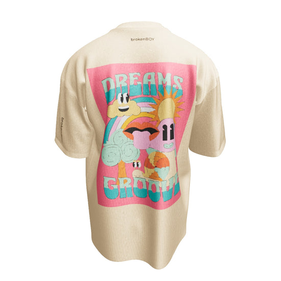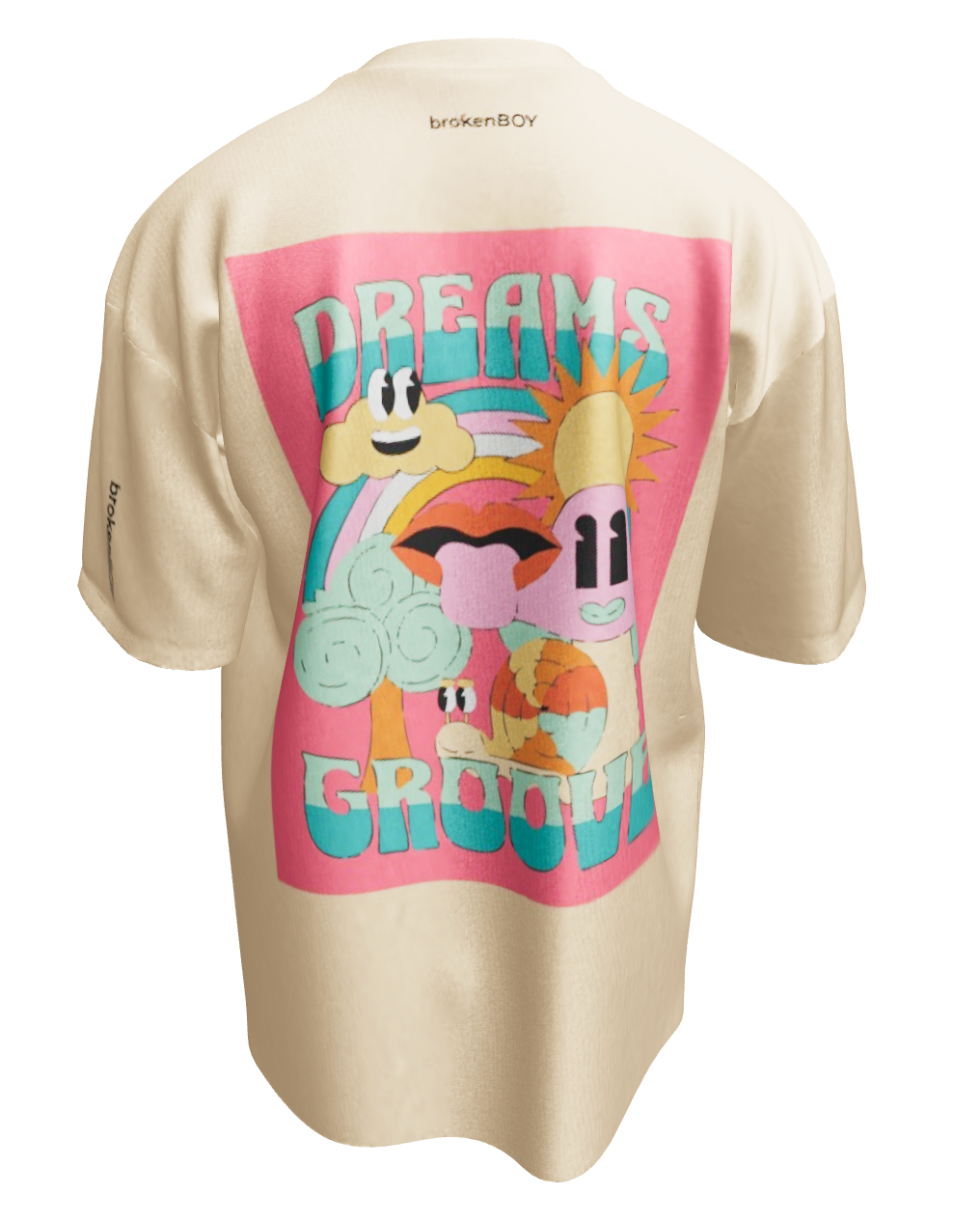 Estampado “brokenBOY” en negro, posicionado en la parte superior de la espalda, reafirmando la identidad de la marca, mientras que en la parte inferior el colorido diseño "Dreams Groove" expresando suaves detalles coloridos como si estuvieras en un sueño.