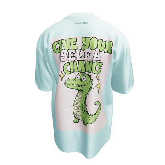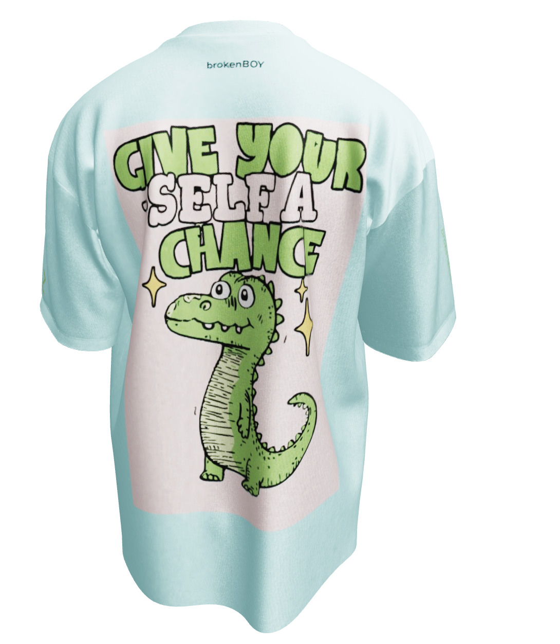 Estampado “brokenBOY” en negro, posicionado en la parte superior de la espalda, reafirmando la identidad de la marca, mientras que en la parte inferior el diseño de un cocodrilo tierno y resistente, animándote a que te aferres a lo que quieres y la leyenda "Give Yourself A Chance"