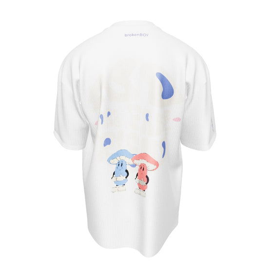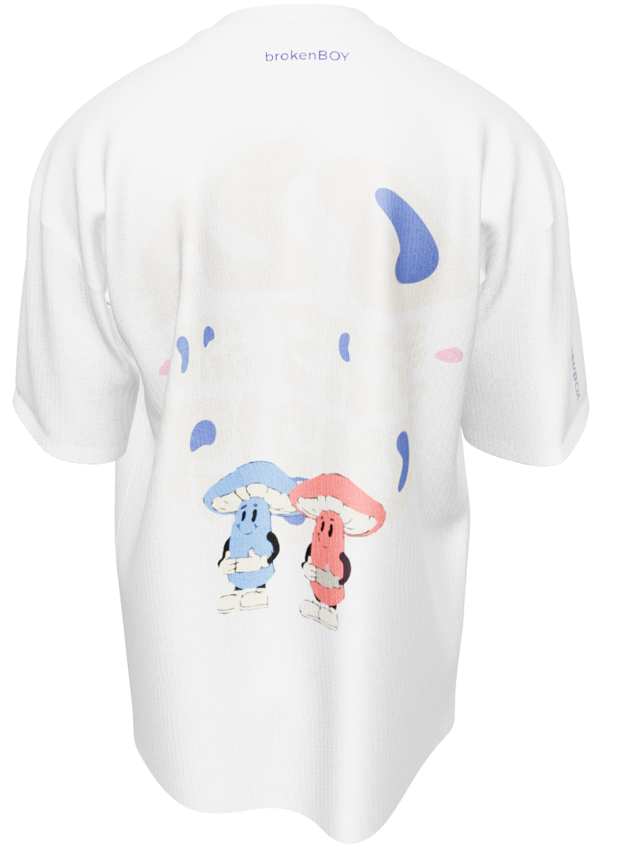 Estampado “brokenBOY” en azul, posicionado en la parte superior de la espalda, reafirmando la identidad de la marca, mientras que en la parte inferior el icónico diseño "No More Fake Friends" resaltando la importancia de una bonita amistad sincera y fiel.